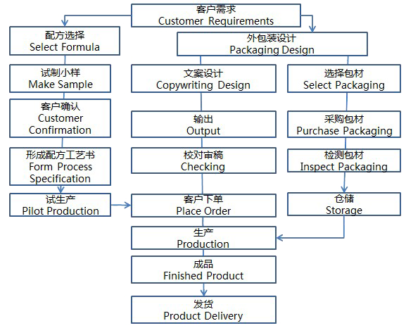 配方研發(fā)、包材原料采購、VI設計、產(chǎn)品灌裝、產(chǎn)品送檢、三證提供的全過程。