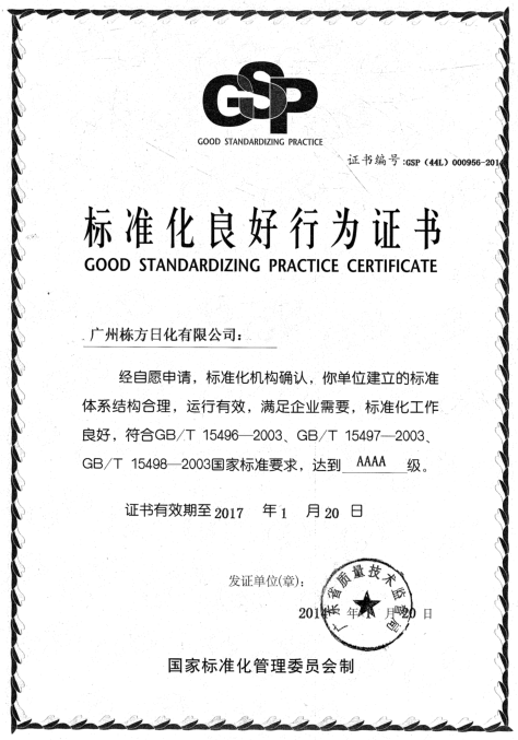 2017年4月20日,廣州市質(zhì)量監(jiān)督檢測研究院與標準化研究院組織6人評審組,對廣州棟方生物科技股份有限公司進行了“標準化良好行為企業(yè)”首次復審。經(jīng)一系列嚴苛的資料審核、現(xiàn)場確認等程序,棟方股份以總計465的高分(總分500)優(yōu)勢,順利通過專家評審組的一致確認,繼續(xù)保持“國家AAAA級標準化良好行為企業(yè)”的榮譽稱號。