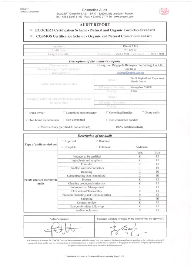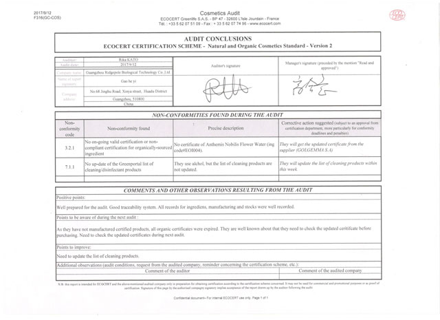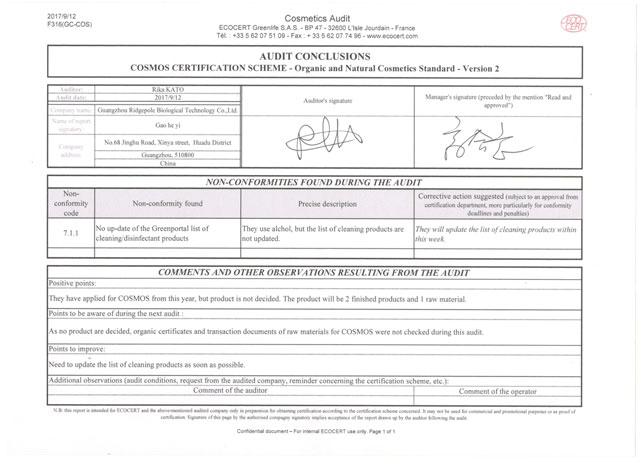 經(jīng)一系列嚴(yán)苛的文件資料審核、現(xiàn)場確認(rèn)等程序,棟方股份順利通過檢查組一致確認(rèn),繼續(xù)保持“歐盟ECOCERT天然有機(jī)化妝品生產(chǎn)認(rèn)證”榮譽(yù)資質(zhì)。
